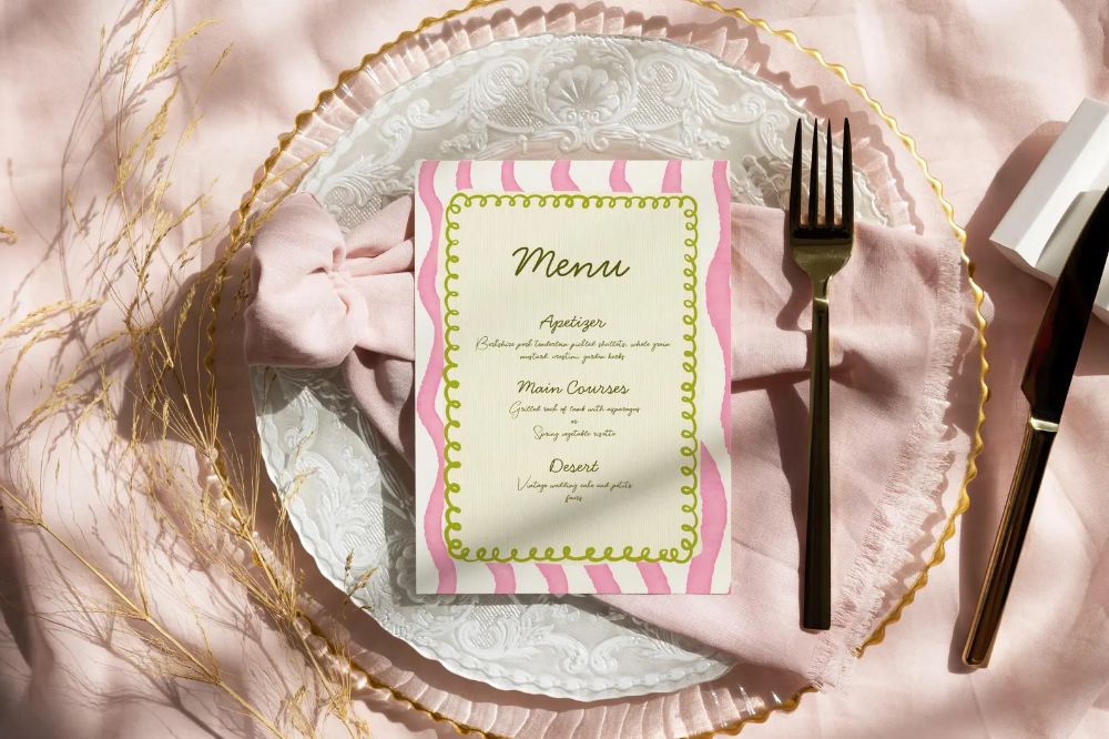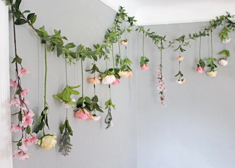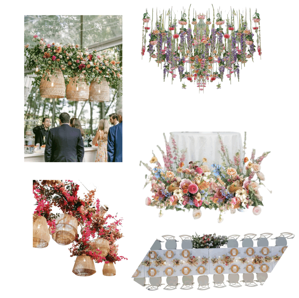 These are a couple examples of tablescapes that would work well. You could go with either cream or grey linens depending on what you prefer. I’d probably keep the runner and napkins the same color. I wasn’t able to find a cheesecloth napkin online in a light grey, although sometimes it’s hard to tell exact colors from a computer, so the one I linked below might be fine. I think a light grey would make the colors pop the best (vs. dark grey). The second option is more budget-friendly, without as many arrangements, and bud vases you could style yourself instead of paying for through a florist, if that interests you. The candles could obviously be whatever colors you like, I personally think the contrast of blush and lilac look really good against the bright wildflowers. Cream would also be really classy. I wasn’t sure if you plan on having a menu card, but they look nice as part of the table setting sometimes. I love the overhead hanging flower look! If you didn’t want to do it across all the tables in the pavillion, it would look nice just over the head table (if you plan on having one), or a food or dessert display. The table-rod look over each individual table with flowers hanging from it is pretty too, but I think that style would look better if you were eating in an uncovered area outside.