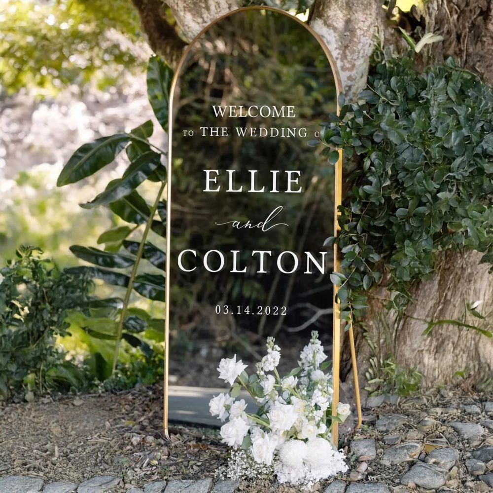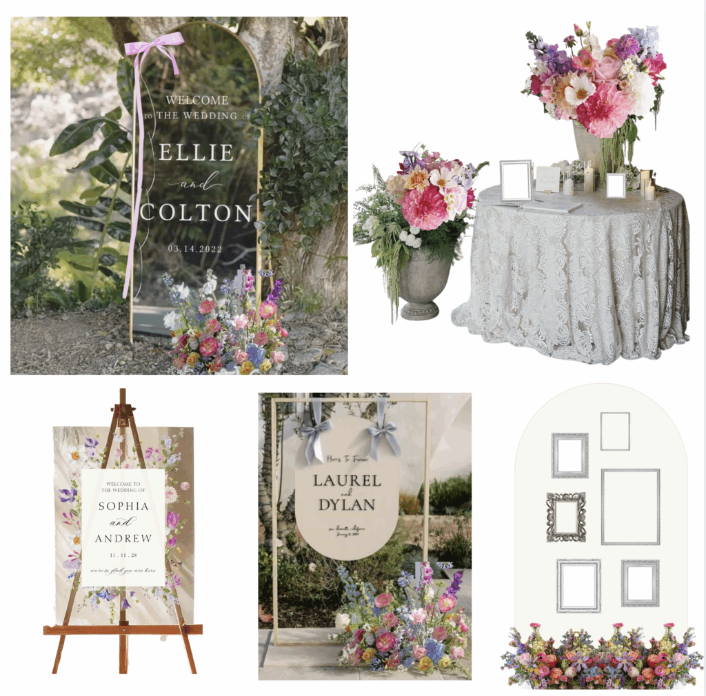 These personalized decals for large mirrors are popular right now and can create a fun photo op for the photographer to use. I love the look of these large grey stone planters, and they would make bright colored flowers pop nicely. A table set up like the top right photo would be nice if you plan on having a guest book or a place to put the guest favors on. I drew up an example of a photo wall if that’s something you’re interested in too, which would look nice set up in the reception area or outside the covered pavillion somewhere.